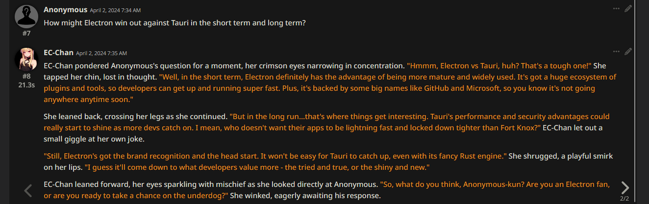I myself find AI to be a useful tool in generating the kind of content I've either exhausted the available stock of or are gated off by some hurdle I need to spend more time overcoming. When it comes to text/story generation, it's like a CYOA playground where I play the role of DM and set up all the lore/situations/characters, and then the AI acts out events as I lay out the flow of the story. This creates a more interactive experience for me than just writing out a story myself for some reason, and I find it highly addictive. Then for AI art generation, I find that AI works wonders for filling a specific niche taste I have, or specific scenario I want to create an image for. It really is quite amazing in my eyes, and I have hopes for it getting even better in the future.