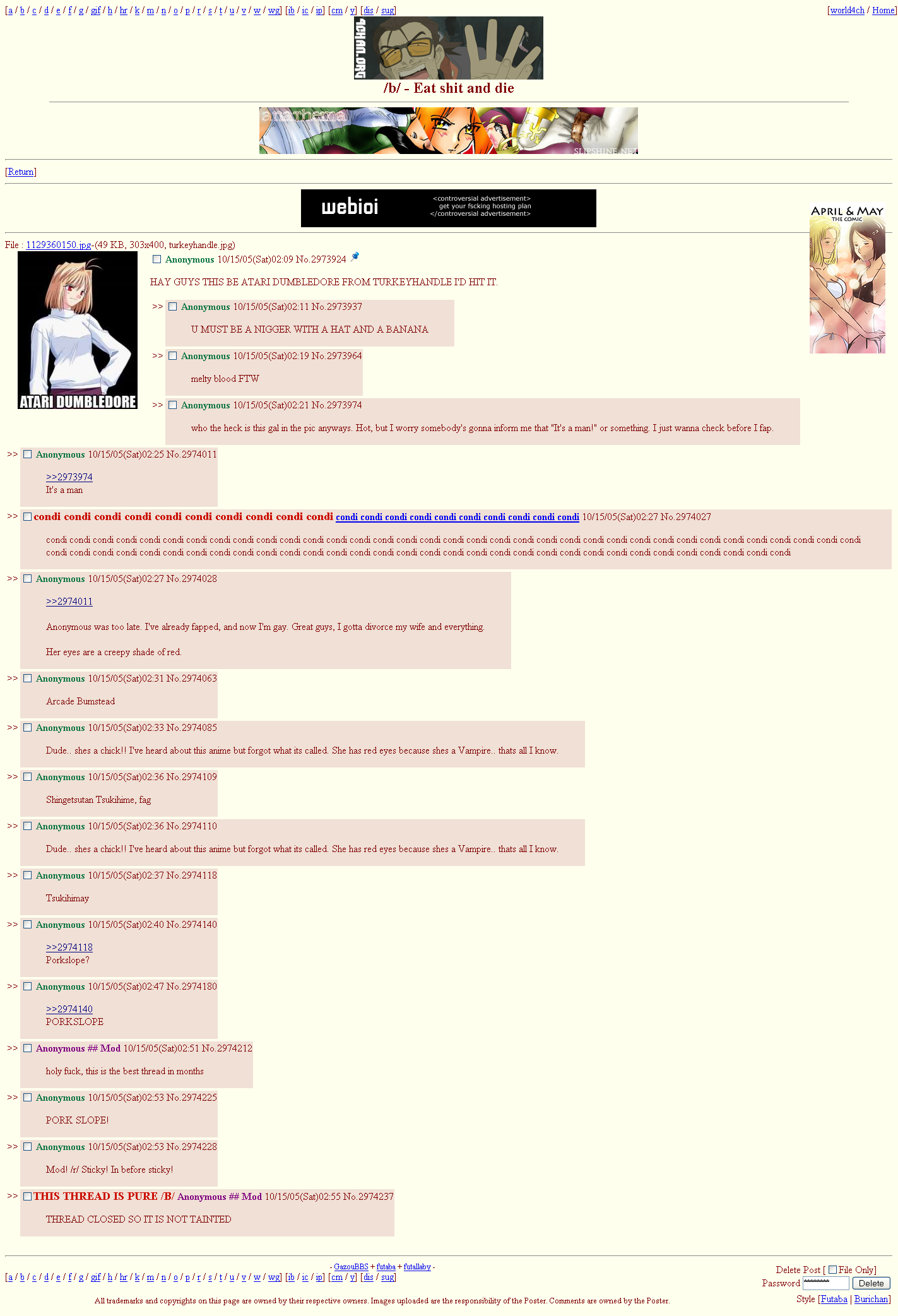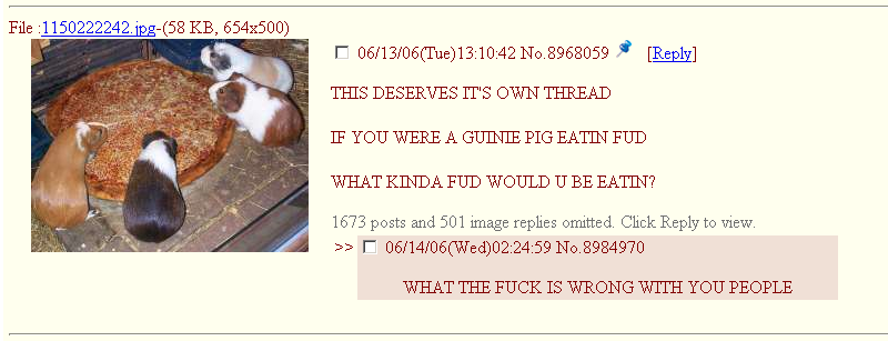 The speed is simply something I gave as an example of making proper discussion harder. It doesn't really affect the production of OC/memes though. A meme gets posted multiple times unlike a single thread/post made with effort, so it doesn't matter if a memepost archives, because it will be posted again sometime. Or it can live through screencaps if it's funny enough like the pics we're posting. This is a bigger problem in boards that have discussion instead of memes as their primary goal. moot was upset with people treating /v/ like /b/ back then because he wanted the board to have on-topic discussions (he's still a fag though, but he wasn't exactly wrong on this one).