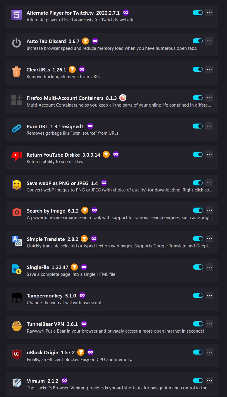 Tridactyl, Tree Style Tab, and Tab Session Manager are nice. Librewolf is nice.