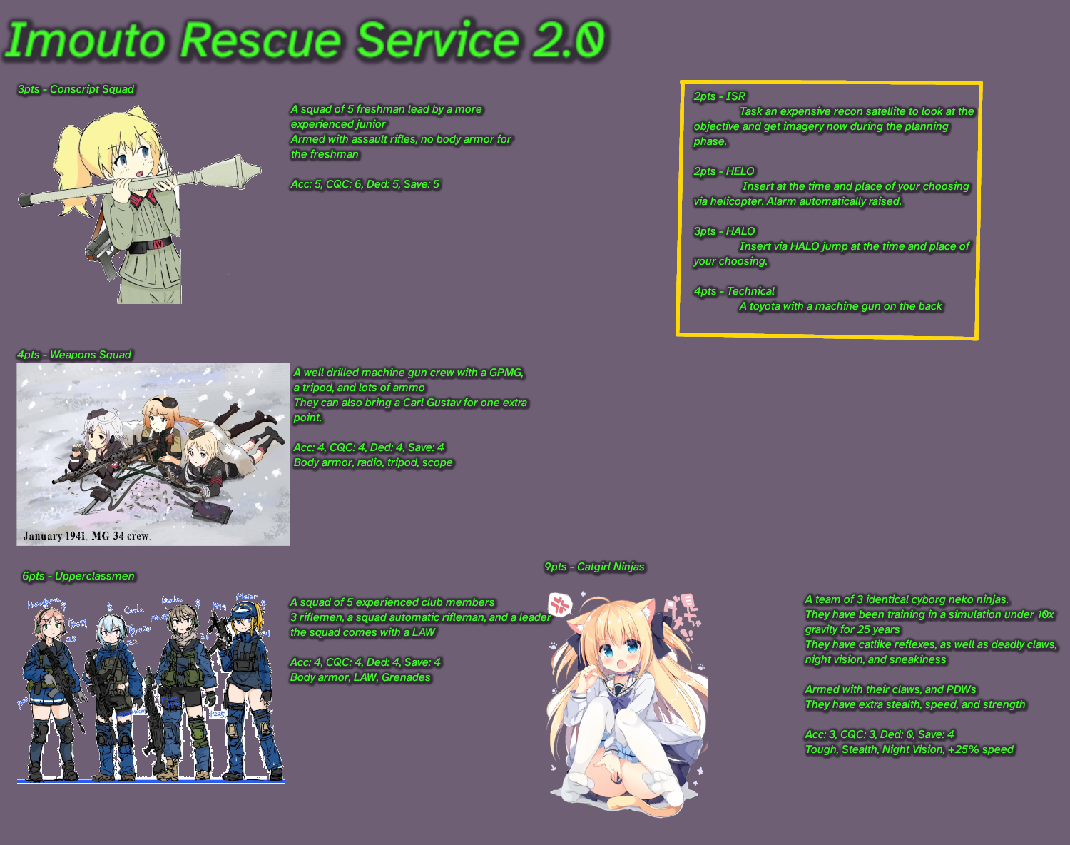 I was considering the catgirl ninjas, but I really want those upperclassmen and the ninjas leave little room for other squads. Think my pick if nobody else objects would be the Upperclassmen, Weapons Squad, then ISR and HELO.