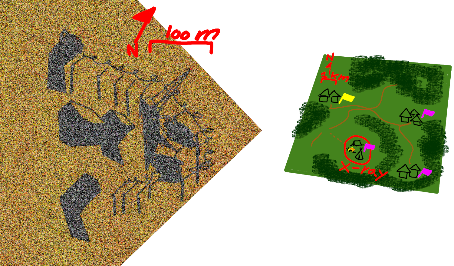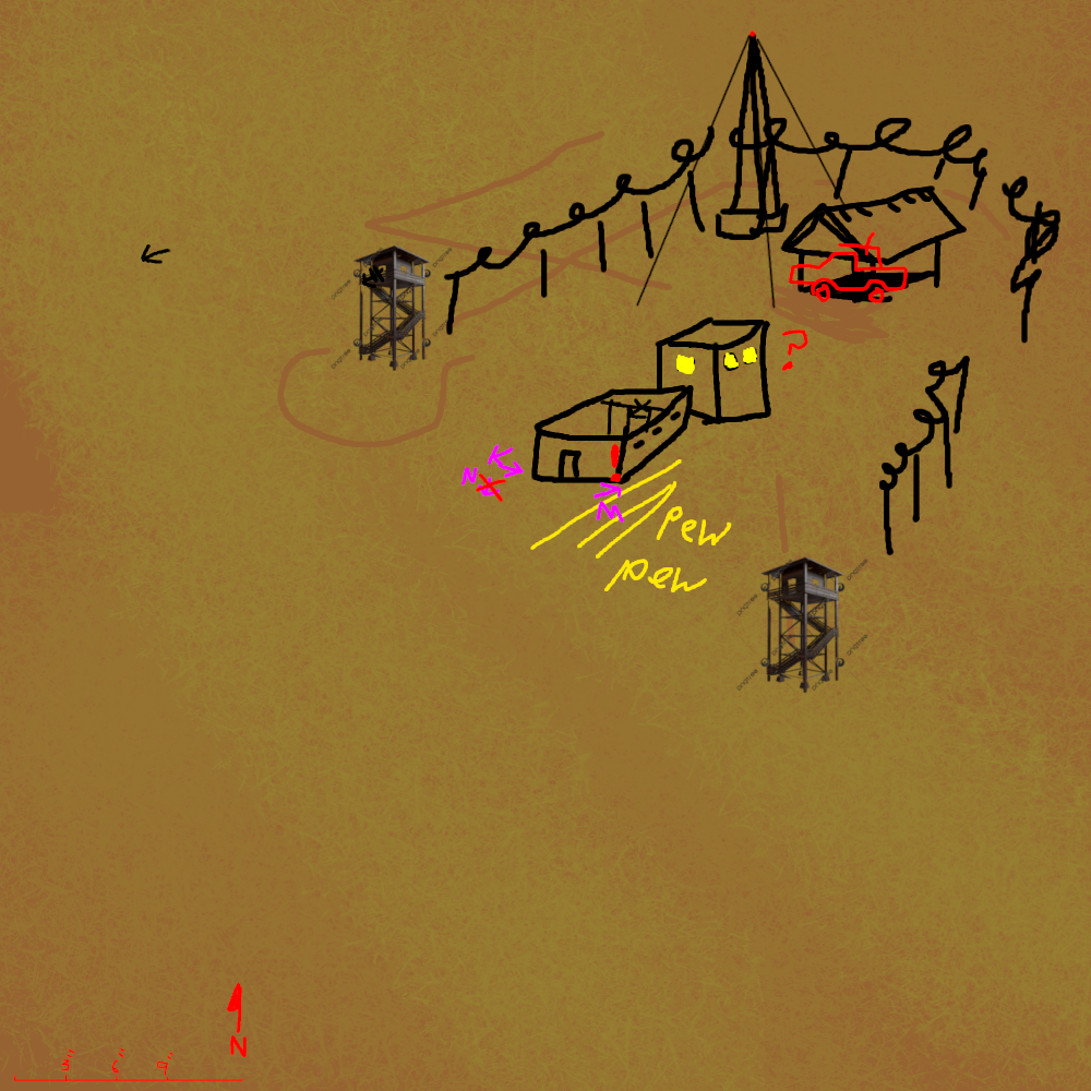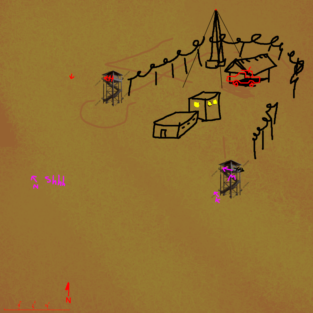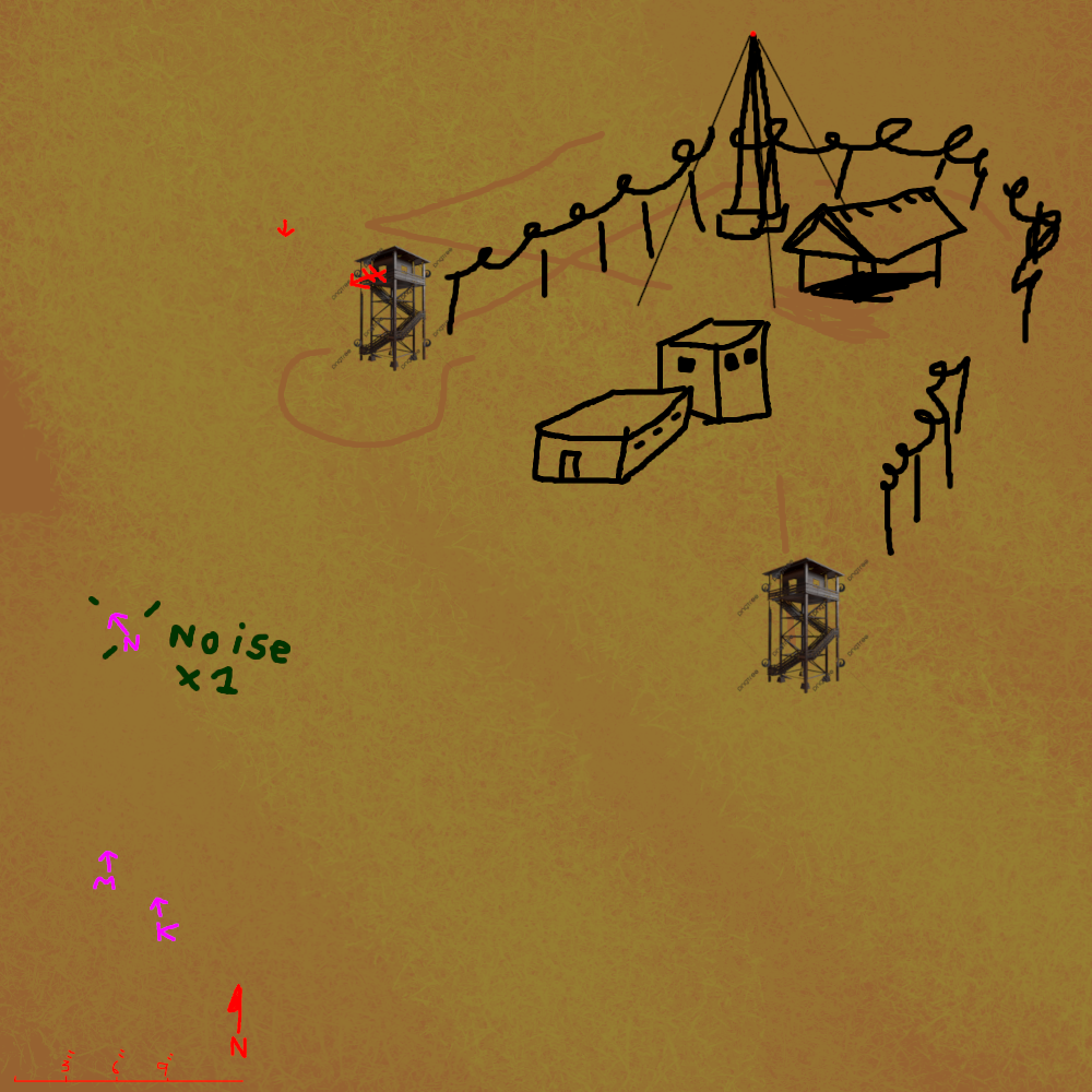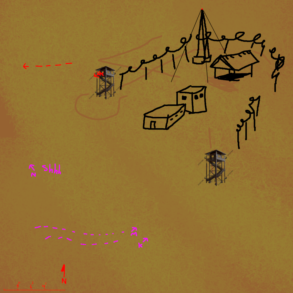>>129091the enemy camp is in a clearing about a kilometer on all sides. The forest is far off the screen. You are in a barren desert with some scrubs and small rocks and micro terrain. There isn't really any natural cover or concealment to speak of. Other than the darkness of night.