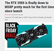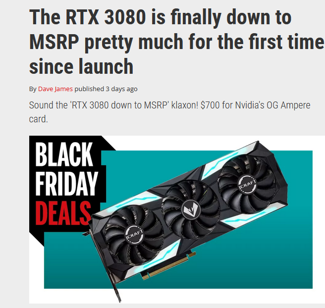 Finally, I was holding off on there being a "deal" (deal in quotations because no nvidia card can be called a deal) and bought a 3080 12GB for $750 which I'm feeling cnostant guilt over. AARARRGGGHGHHAUJSDHAUSJKHDKAS! It was so much money! But it's "normal" price if you were able to find it new like I did during the holiday sale was about $900, so I feel kind of happy aobut that.