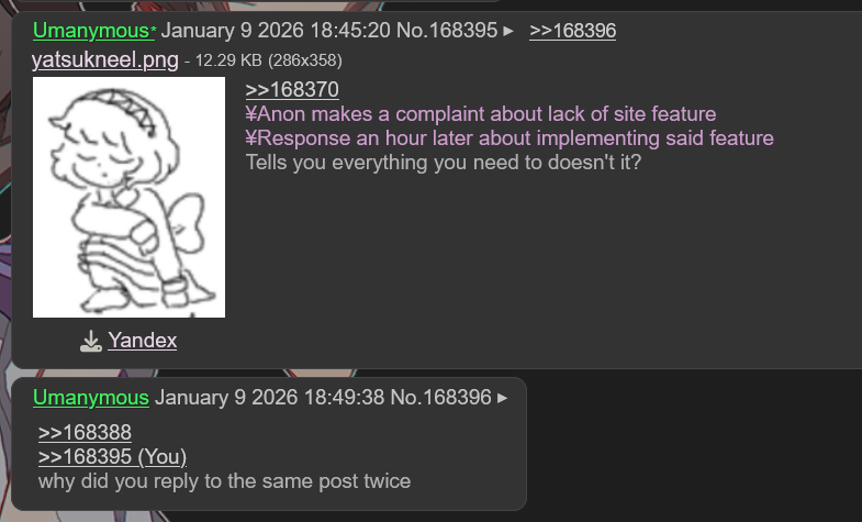 https://github.com/fallenPineapple/NPFchan/commit/3cb3ef692e315df54d24f2c4a240e4fa5513297eAnd it stopped the guy who was harassing them with necrobumps, preventing a perpetual war between them and /qa/.
